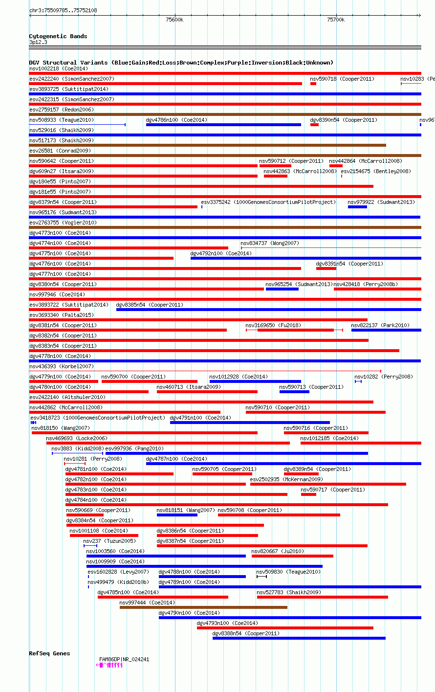 Variant DetailsVariant: nsv1001704| Internal ID | 19090921 | | Landmark | | | Location Information | | | Cytoband | 3p12.3 | | Allele length | | Assembly | Allele length | | hg38 | 242324 | | hg19 | 242324 | | hg18 | 242324 |
