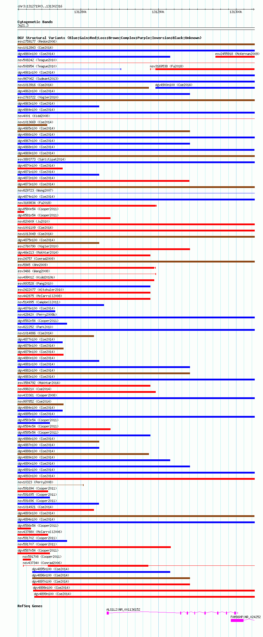 | | Variant Type | CNV gain | | Copy Number | | | Allele State | | | Allele Origin | | | Probe Count | | | Validation Flag | | | Merged Status | M | | Merged Variants | dgv4891n100 | | Supporting Variants | nssv3607024 | | Samples | | | Known Genes | ALG1L2, FAM86HP | | Method | SNP array | | Analysis | Affymetrix SNP array copy number analysis | | Platform | Affymetrix SNP Array 6.0 | | Comments | | | Reference | Coe_et_al_2014 | | Pubmed ID | 25217958 | | Accession Number(s) | nsv1001988