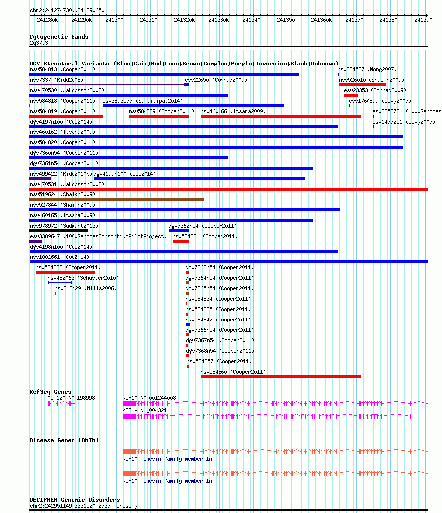 | | Variant Type | CNV gain | | Copy Number | | | Allele State | | | Allele Origin | | | Probe Count | | | Validation Flag | | | Merged Status | M | | Merged Variants | | | Supporting Variants | nssv3730128 | | Samples | | | Known Genes | AQP12A, KIF1A | | Method | SNP array | | Analysis | Affymetrix SNP array copy number analysis | | Platform | Affymetrix SNP Array 6.0 | | Comments | | | Reference | Coe_et_al_2014 | | Pubmed ID | 25217958 | | Accession Number(s) | nsv1002661