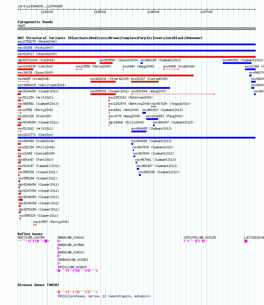 | | Variant Type | CNV gain | | Copy Number | | | Allele State | | | Allele Origin | | | Probe Count | | | Validation Flag | | | Merged Status | M | | Merged Variants | | | Supporting Variants | nssv3639341, nssv3743089 | | Samples | | | Known Genes | CEP170P1, LOC729218, NDST3, PRSS12, SNHG8, SNORA24 | | Method | SNP array | | Analysis | Affymetrix SNP array copy number analysis | | Platform | Affymetrix SNP Array 6.0 | | Comments | | | Reference | Coe_et_al_2014 | | Pubmed ID | 25217958 | | Accession Number(s) | nsv1002771