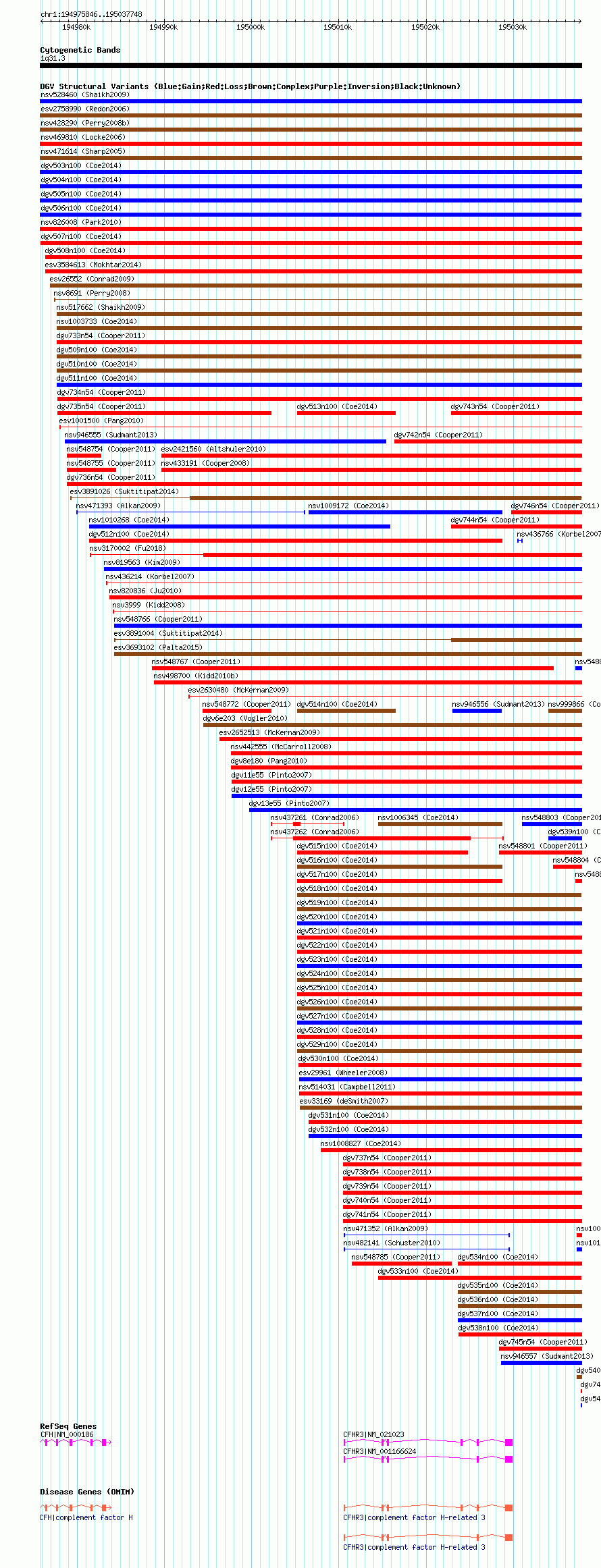 | | Variant Type | CNV gain | | Copy Number | | | Allele State | | | Allele Origin | | | Probe Count | | | Validation Flag | | | Merged Status | M | | Merged Variants | dgv506n100 | | Supporting Variants | nssv3704889 | | Samples | | | Known Genes | CFH, CFHR3 | | Method | SNP array | | Analysis | Affymetrix SNP array copy number analysis | | Platform | Affymetrix SNP Array 6.0 | | Comments | | | Reference | Coe_et_al_2014 | | Pubmed ID | 25217958 | | Accession Number(s) | nsv1003137