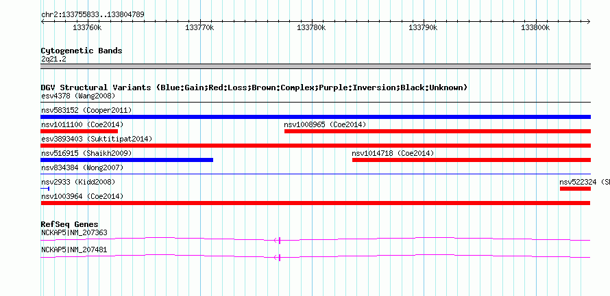 | Variant Type | CNV loss | Copy Number | | Allele State | | Allele Origin | | Probe Count | | Validation Flag | | Merged Status | M | Merged Variants | | Supporting Variants | nssv3582788 | Samples | | Known Genes | MIR7853, NCKAP5 | Method | SNP array | Analysis | Affymetrix SNP array copy number analysis | Platform | Affymetrix SNP Array 6.0 | Comments | | Reference | Coe_et_al_2014 | Pubmed ID | 25217958 | Accession Number(s) | nsv1003964