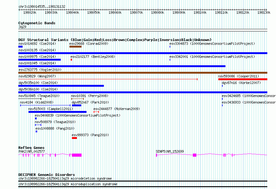 | | Variant Type | CNV gain | | Copy Number | | | Allele State | | | Allele Origin | | | Probe Count | | | Validation Flag | | | Merged Status | M | | Merged Variants | dgv5036n100 | | Supporting Variants | nssv3737878 | | Samples | | | Known Genes | PAK2, SENP5 | | Method | SNP array | | Analysis | Affymetrix SNP array copy number analysis | | Platform | Affymetrix SNP Array 6.0 | | Comments | | | Reference | Coe_et_al_2014 | | Pubmed ID | 25217958 | | Accession Number(s) | nsv1004269