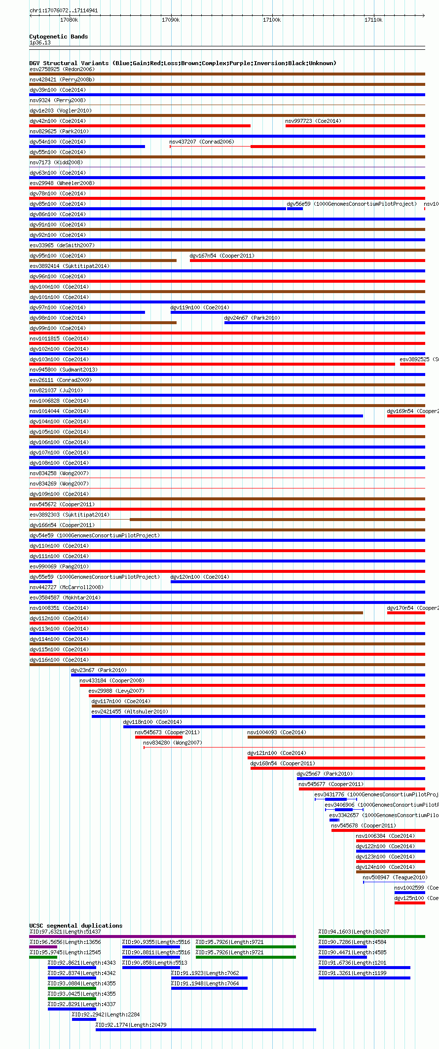 Variant DetailsVariant: nsv1004806| Internal ID | 18747337 | | Landmark | | | Location Information | | | Cytoband | 1p36.13 | | Allele length | | Assembly | Allele length | | hg38 | 38870 | | hg19 | 38870 | | hg18 | 38870 |