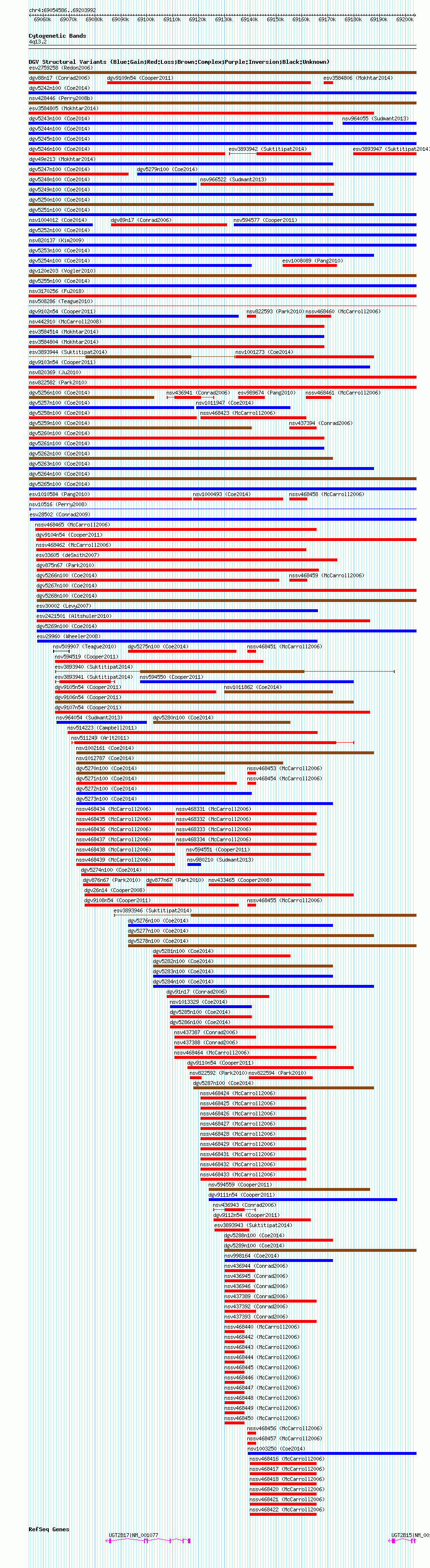 Variant DetailsVariant: nsv1005276 | Internal ID | 19094493 | | Landmark | | | Location Information | | | Cytoband | 4q13.2 | | Allele length | | Assembly | Allele length | | hg38 | 149407 | | hg19 | 149407 | | hg18 | 149407 |
