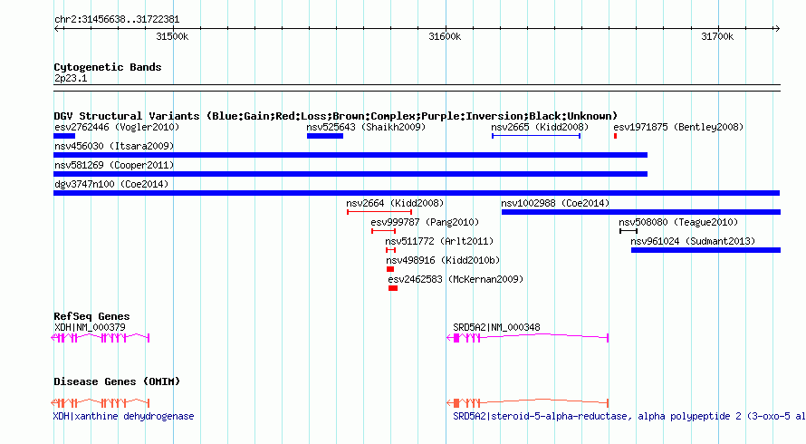 | | Variant Type | CNV gain | | Copy Number | | | Allele State | | | Allele Origin | | | Probe Count | | | Validation Flag | | | Merged Status | M | | Merged Variants | dgv3747n100 | | Supporting Variants | nssv3579149 | | Samples | | | Known Genes | SRD5A2, XDH | | Method | SNP array | | Analysis | Affymetrix SNP array copy number analysis | | Platform | Affymetrix SNP Array 6.0 | | Comments | | | Reference | Coe_et_al_2014 | | Pubmed ID | 25217958 | | Accession Number(s) | nsv1005565