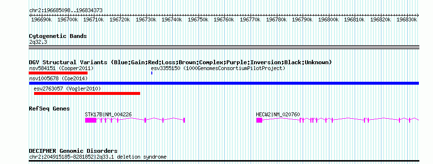 | | Variant Type | CNV gain | | Copy Number | | | Allele State | | | Allele Origin | | | Probe Count | | | Validation Flag | | | Merged Status | M | | Merged Variants | | | Supporting Variants | nssv3583984 | | Samples | | | Known Genes | HECW2, STK17B | | Method | SNP array | | Analysis | Affymetrix SNP array copy number analysis | | Platform | Affymetrix SNP Array 6.0 | | Comments | | | Reference | Coe_et_al_2014 | | Pubmed ID | 25217958 | | Accession Number(s) | nsv1005678