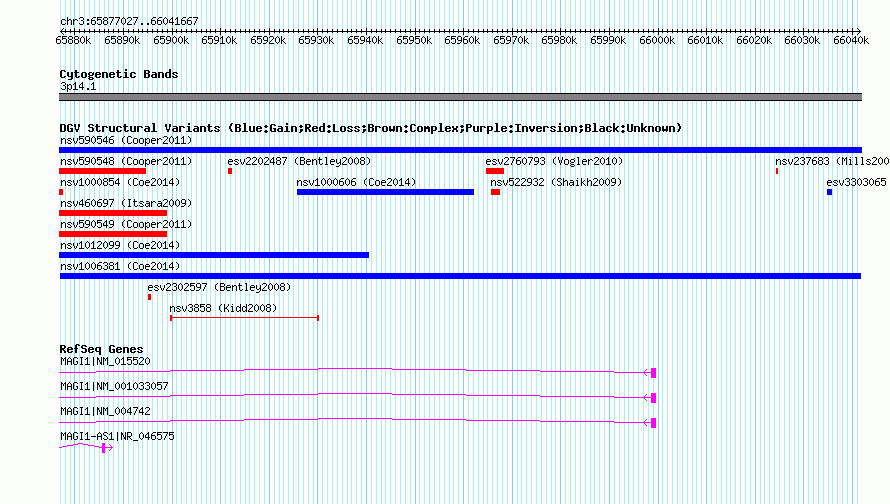 | Variant Type | CNV gain | Copy Number | | Allele State | | Allele Origin | | Probe Count | | Validation Flag | | Merged Status | M | Merged Variants | | Supporting Variants | nssv3593962 | Samples | | Known Genes | MAGI1, MAGI1-AS1 | Method | SNP array | Analysis | Affymetrix SNP array copy number analysis | Platform | Affymetrix SNP Array 6.0 | Comments | | Reference | Coe_et_al_2014 | Pubmed ID | 25217958 | Accession Number(s) | nsv1006381