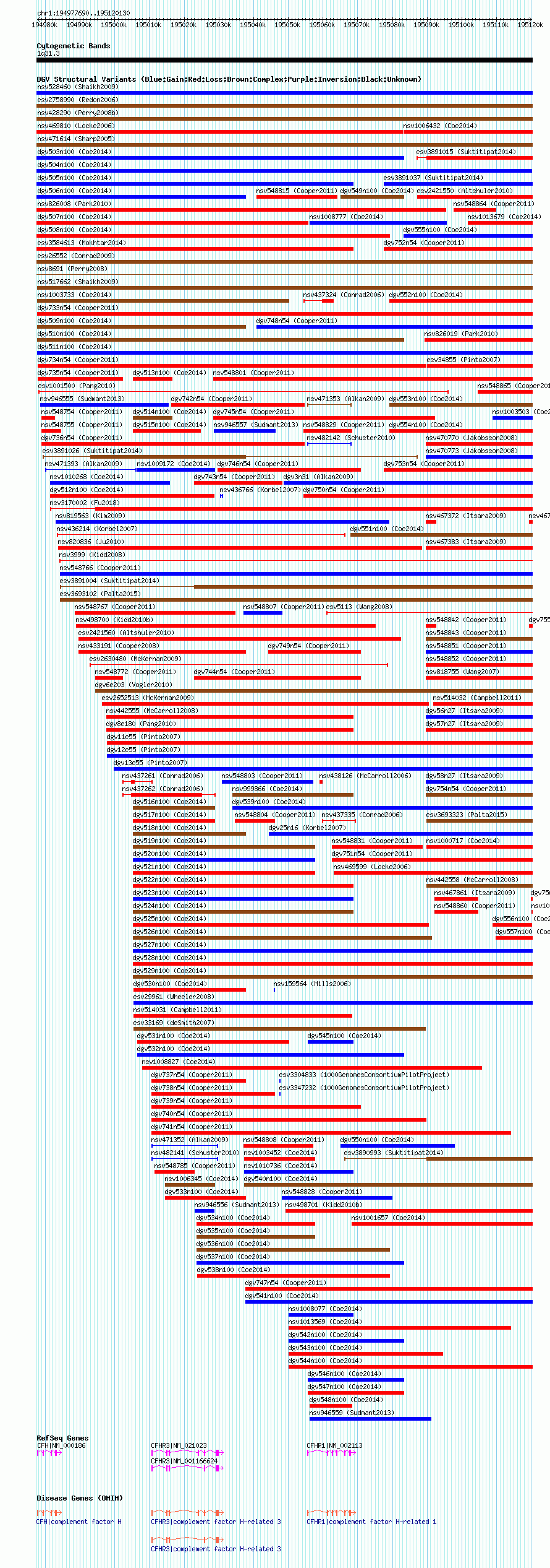 | | Variant Type | CNV gain | | Copy Number | | | Allele State | | | Allele Origin | | | Probe Count | | | Validation Flag | | | Merged Status | M | | Merged Variants | dgv504n100 | | Supporting Variants | nssv3486960 | | Samples | | | Known Genes | CFH, CFHR1, CFHR3 | | Method | SNP array | | Analysis | Affymetrix SNP array copy number analysis | | Platform | Affymetrix SNP Array 6.0 | | Comments | | | Reference | Coe_et_al_2014 | | Pubmed ID | 25217958 | | Accession Number(s) | nsv1006453