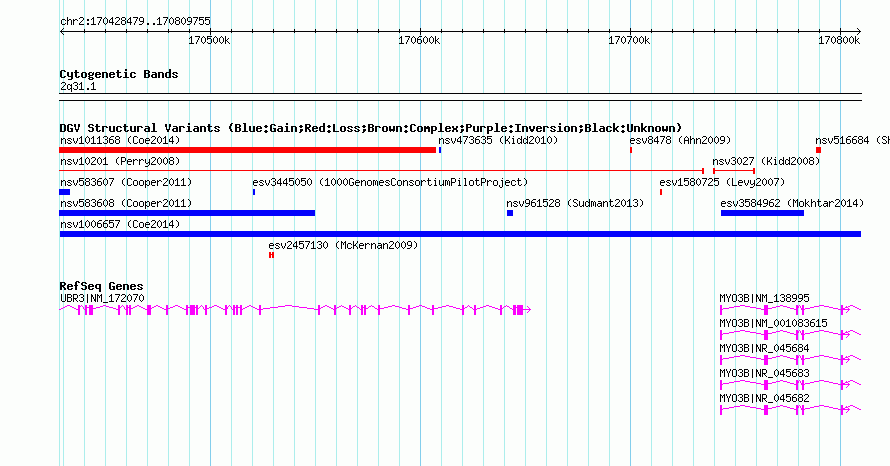 | Variant Type | CNV gain | Copy Number | | Allele State | | Allele Origin | | Probe Count | | Validation Flag | | Merged Status | M | Merged Variants | | Supporting Variants | nssv3583034 | Samples | | Known Genes | MYO3B, UBR3 | Method | SNP array | Analysis | Affymetrix SNP array copy number analysis | Platform | Affymetrix SNP Array 6.0 | Comments | | Reference | Coe_et_al_2014 | Pubmed ID | 25217958 | Accession Number(s) | nsv1006657