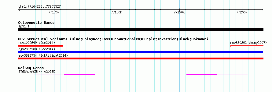 Variant DetailsVariant: nsv1006696| Internal ID | 19095914 | | Landmark | | | Location Information | | | Cytoband | 1p31.1 | | Allele length | | Assembly | Allele length | | hg38 | 39040 | | hg19 | 39040 | | hg18 | 39040 |