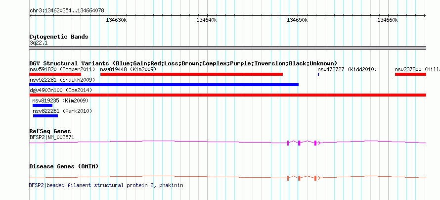 | Variant Type | CNV loss | Copy Number | | Allele State | | Allele Origin | | Probe Count | | Validation Flag | | Merged Status | M | Merged Variants | dgv4903n100 | Supporting Variants | nssv3607142, nssv3607143 | Samples | | Known Genes | BFSP2 | Method | SNP array | Analysis | Affymetrix SNP array copy number analysis | Platform | Affymetrix SNP Array 6.0 | Comments | | Reference | Coe_et_al_2014 | Pubmed ID | 25217958 | Accession Number(s) | nsv1007047