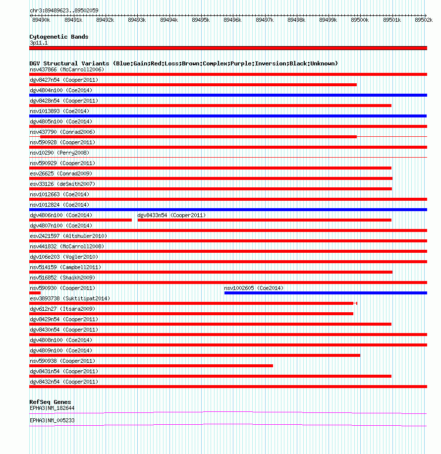 | | Variant Type | CNV loss | | Copy Number | | | Allele State | | | Allele Origin | | | Probe Count | | | Validation Flag | | | Merged Status | M | | Merged Variants | dgv4808n100 | | Supporting Variants | nssv3603224, nssv3603228, nssv3603215, nssv3603219, nssv3603227, nssv3603223, nssv3603222, nssv3603212, nssv3603214, nssv3603217, nssv3603225, nssv3603216, nssv3603226, nssv3603230, nssv3603229, nssv3603220, nssv3603221, nssv3603210, nssv3603211, nssv3735171, nssv3735170, nssv3603218, nssv3603213 | | Samples | | | Known Genes | EPHA3 | | Method | SNP array | | Analysis | Affymetrix SNP array copy number analysis | | Platform | Affymetrix SNP Array 6.0 | | Comments | | | Reference | Coe_et_al_2014 | | Pubmed ID | 25217958 | | Accession Number(s) | nsv1007058