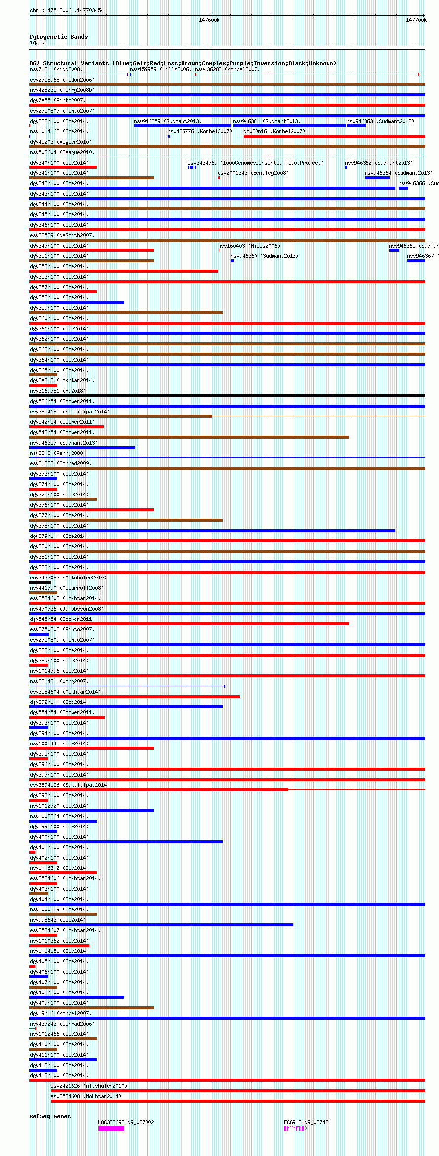 Variant DetailsVariant: nsv1007332| Internal ID | 19096551 | | Landmark | | | Location Information | | | Cytoband | 1q21.1 | | Allele length | | Assembly | Allele length | | hg38 | 190528 | | hg19 | 190449 | | hg18 | 190449 |