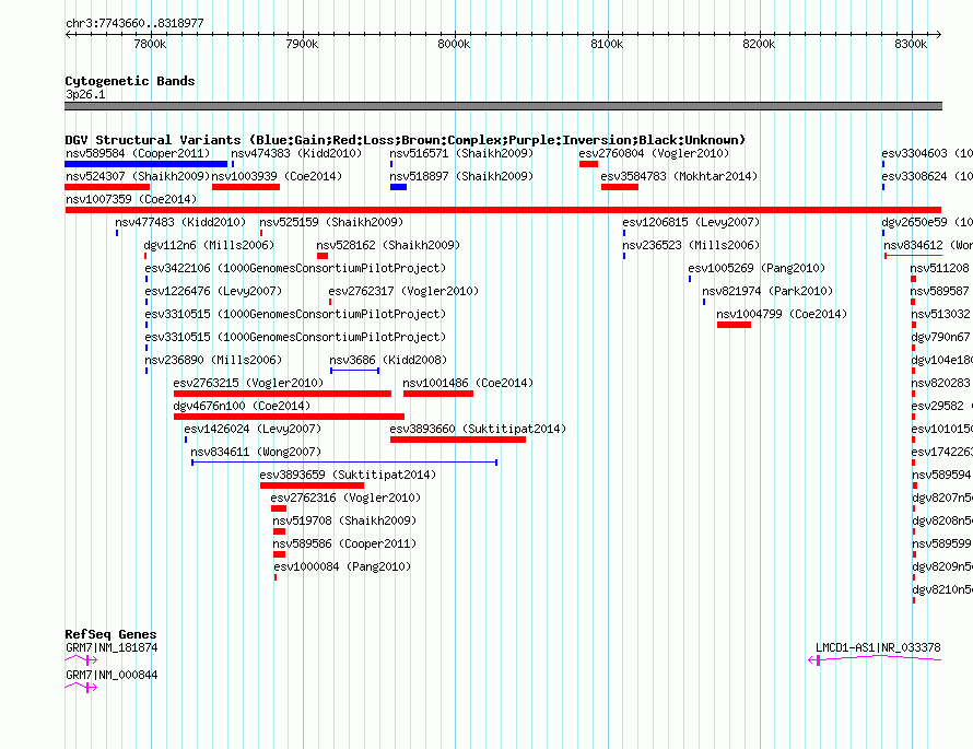 | Variant Type | CNV loss | Copy Number | | Allele State | | Allele Origin | | Probe Count | | Validation Flag | | Merged Status | M | Merged Variants | | Supporting Variants | nssv3591835, nssv3591836 | Samples | | Known Genes | GRM7, LMCD1-AS1 | Method | SNP array | Analysis | Affymetrix SNP array copy number analysis | Platform | Affymetrix SNP Array 6.0 | Comments | | Reference | Coe_et_al_2014 | Pubmed ID | 25217958 | Accession Number(s) | nsv1007359