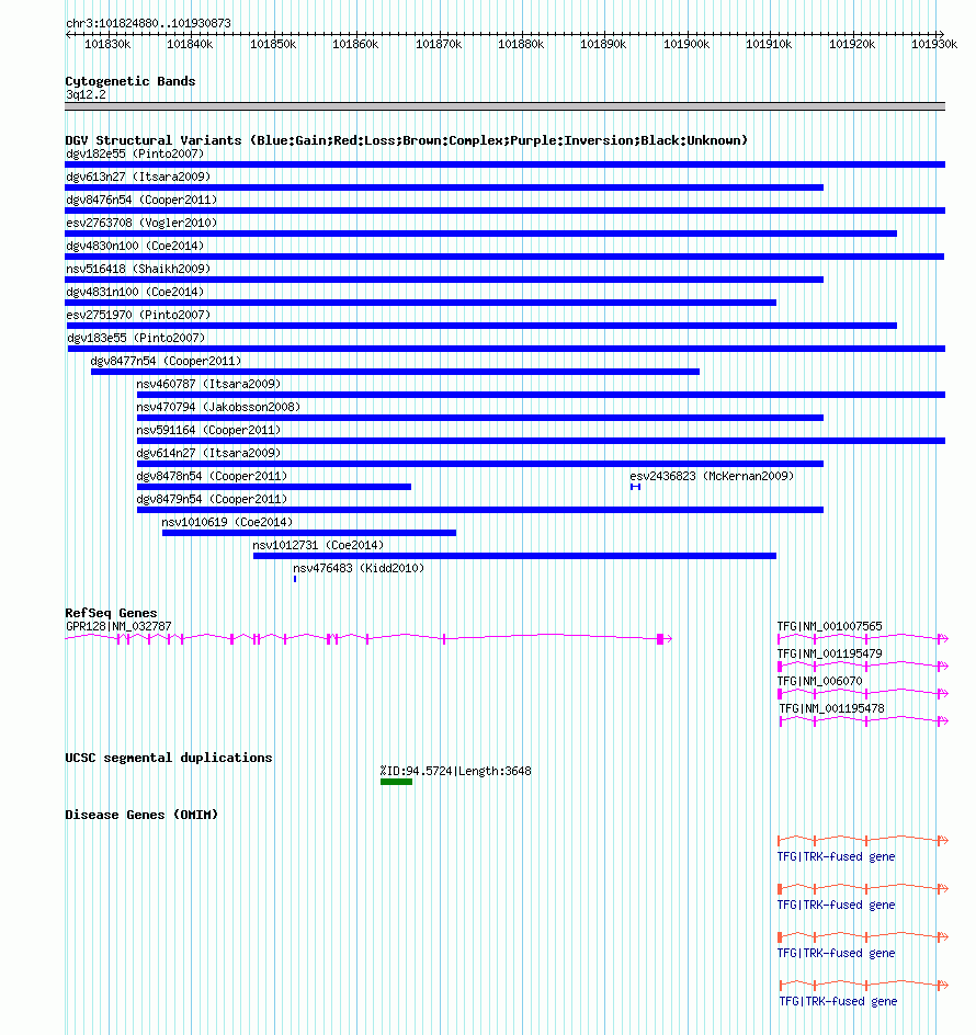 | | Variant Type | CNV gain | | Copy Number | | | Allele State | | | Allele Origin | | | Probe Count | | | Validation Flag | | | Merged Status | M | | Merged Variants | dgv4830n100 | | Supporting Variants | nssv3604354 | | Samples | | | Known Genes | GPR128, TFG | | Method | SNP array | | Analysis | Affymetrix SNP array copy number analysis | | Platform | Affymetrix SNP Array 6.0 | | Comments | | | Reference | Coe_et_al_2014 | | Pubmed ID | 25217958 | | Accession Number(s) | nsv1007437