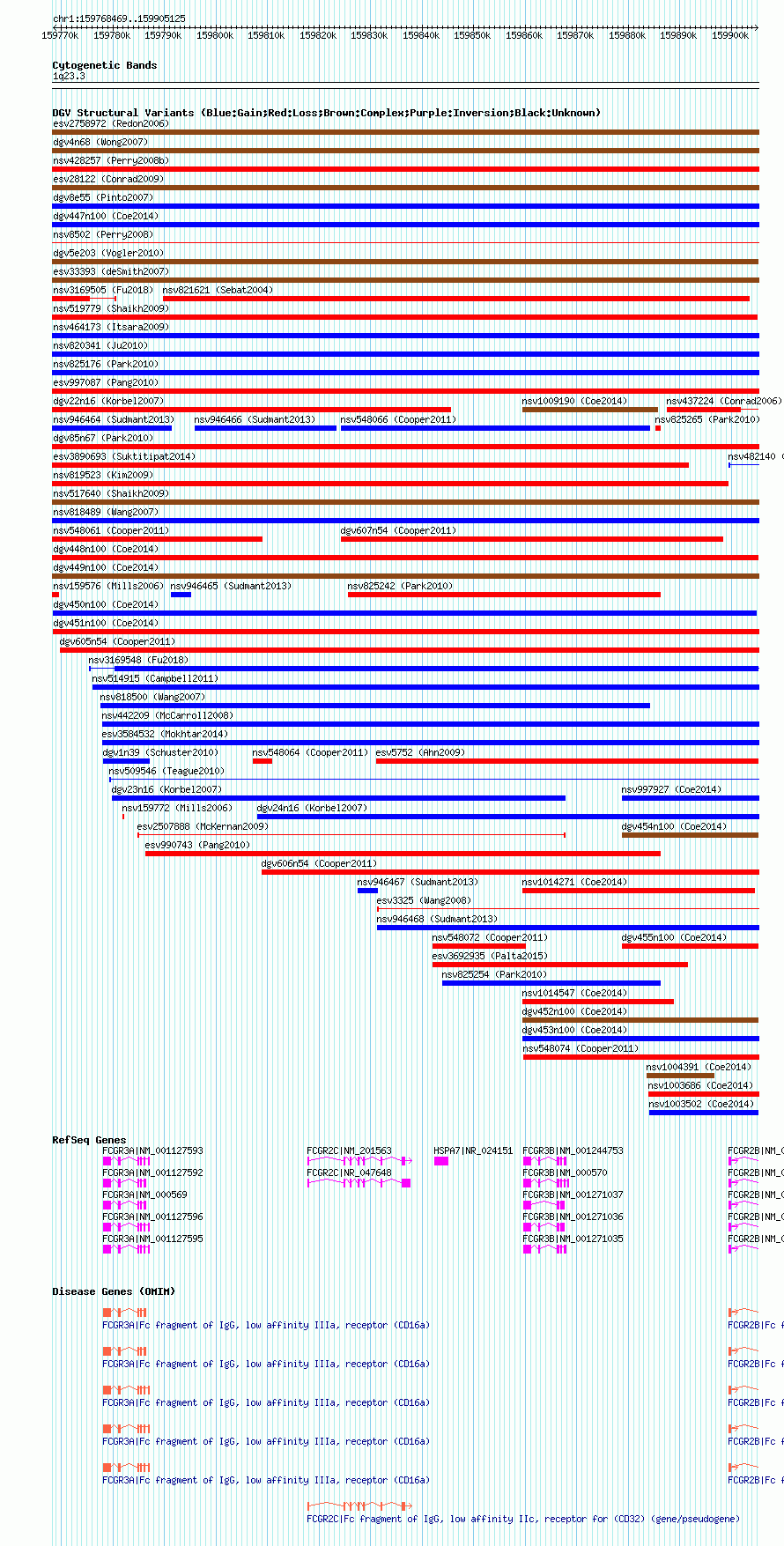 | | Variant Type | CNV gain+loss | | Copy Number | | | Allele State | | | Allele Origin | | | Probe Count | | | Validation Flag | | | Merged Status | M | | Merged Variants | dgv449n100 | | Supporting Variants | nssv3494359, nssv3495449, nssv3704772, nssv3491775, nssv3484815, nssv3488512, nssv3499011, nssv3495217, nssv3487954, nssv3494898, nssv3500415, nssv3501983 | | Samples | | | Known Genes | FCGR2B, FCGR2C, FCGR3A, FCGR3B, HSPA7 | | Method | SNP array | | Analysis | Affymetrix SNP array copy number analysis | | Platform | Affymetrix SNP Array 6.0 | | Comments | | | Reference | Coe_et_al_2014 | | Pubmed ID | 25217958 | | Accession Number(s) | nsv1007578