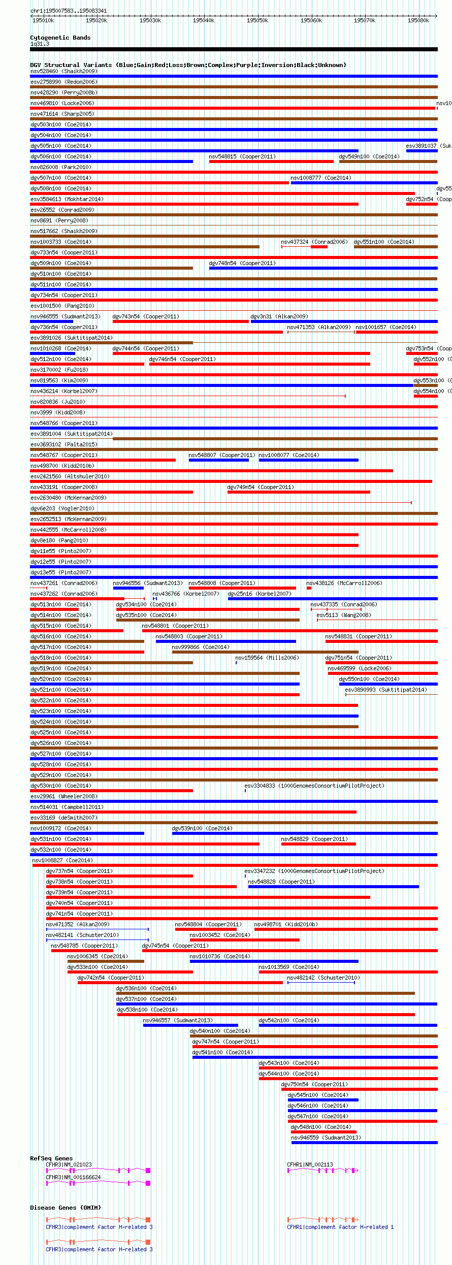 | | Variant Type | CNV gain | | Copy Number | | | Allele State | | | Allele Origin | | | Probe Count | | | Validation Flag | | | Merged Status | M | | Merged Variants | dgv532n100 | | Supporting Variants | nssv3483207, nssv3484066, nssv3501417, nssv3488479 | | Samples | | | Known Genes | CFHR1, CFHR3 | | Method | SNP array | | Analysis | Affymetrix SNP array copy number analysis | | Platform | Affymetrix SNP Array 6.0 | | Comments | | | Reference | Coe_et_al_2014 | | Pubmed ID | 25217958 | | Accession Number(s) | nsv1007628