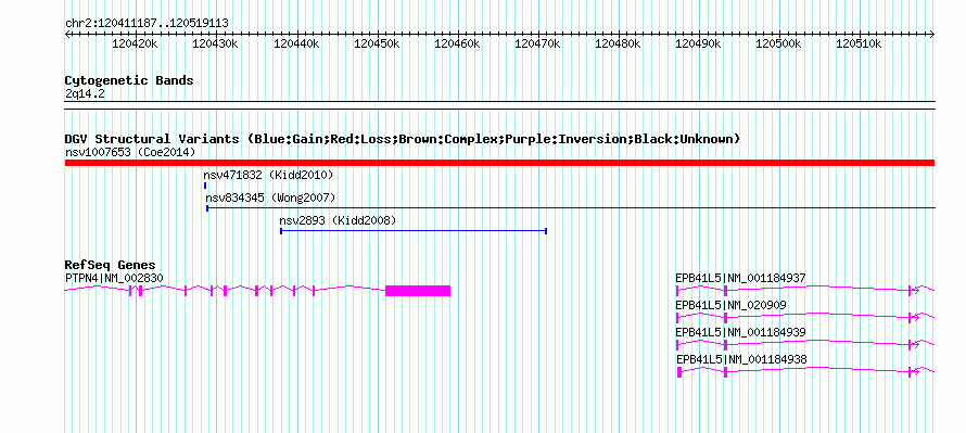 | | Variant Type | CNV loss | | Copy Number | | | Allele State | | | Allele Origin | | | Probe Count | | | Validation Flag | | | Merged Status | M | | Merged Variants | | | Supporting Variants | nssv3729219 | | Samples | | | Known Genes | EPB41L5, PTPN4 | | Method | SNP array | | Analysis | Affymetrix SNP array copy number analysis | | Platform | Affymetrix SNP Array 6.0 | | Comments | | | Reference | Coe_et_al_2014 | | Pubmed ID | 25217958 | | Accession Number(s) | nsv1007653