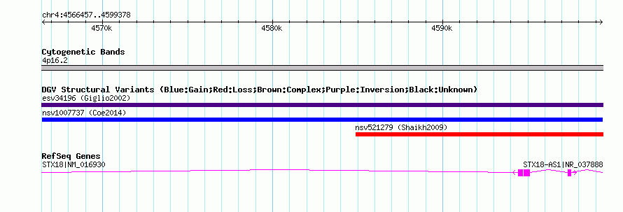 | | Variant Type | CNV gain | | Copy Number | | | Allele State | | | Allele Origin | | | Probe Count | | | Validation Flag | | | Merged Status | M | | Merged Variants | | | Supporting Variants | nssv3616173 | | Samples | | | Known Genes | STX18, STX18-AS1 | | Method | SNP array | | Analysis | Affymetrix SNP array copy number analysis | | Platform | Affymetrix SNP Array 6.0 | | Comments | | | Reference | Coe_et_al_2014 | | Pubmed ID | 25217958 | | Accession Number(s) | nsv1007737