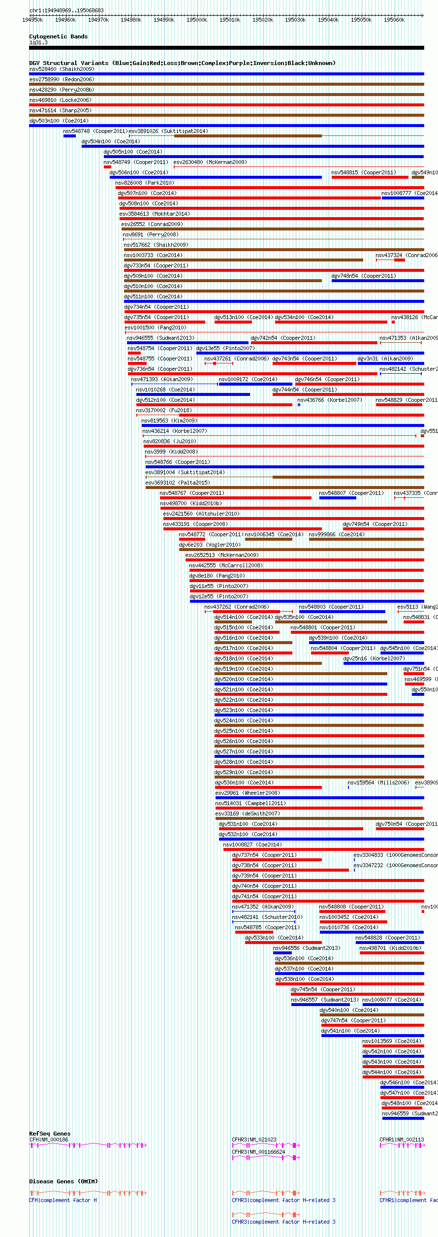 | | Variant Type | CNV gain | | Copy Number | | | Allele State | | | Allele Origin | | | Probe Count | | | Validation Flag | | | Merged Status | M | | Merged Variants | dgv503n100 | | Supporting Variants | nssv3494119, nssv3500313 | | Samples | | | Known Genes | CFH, CFHR1, CFHR3 | | Method | SNP array | | Analysis | Affymetrix SNP array copy number analysis | | Platform | Affymetrix SNP Array 6.0 | | Comments | | | Reference | Coe_et_al_2014 | | Pubmed ID | 25217958 | | Accession Number(s) | nsv1007752
