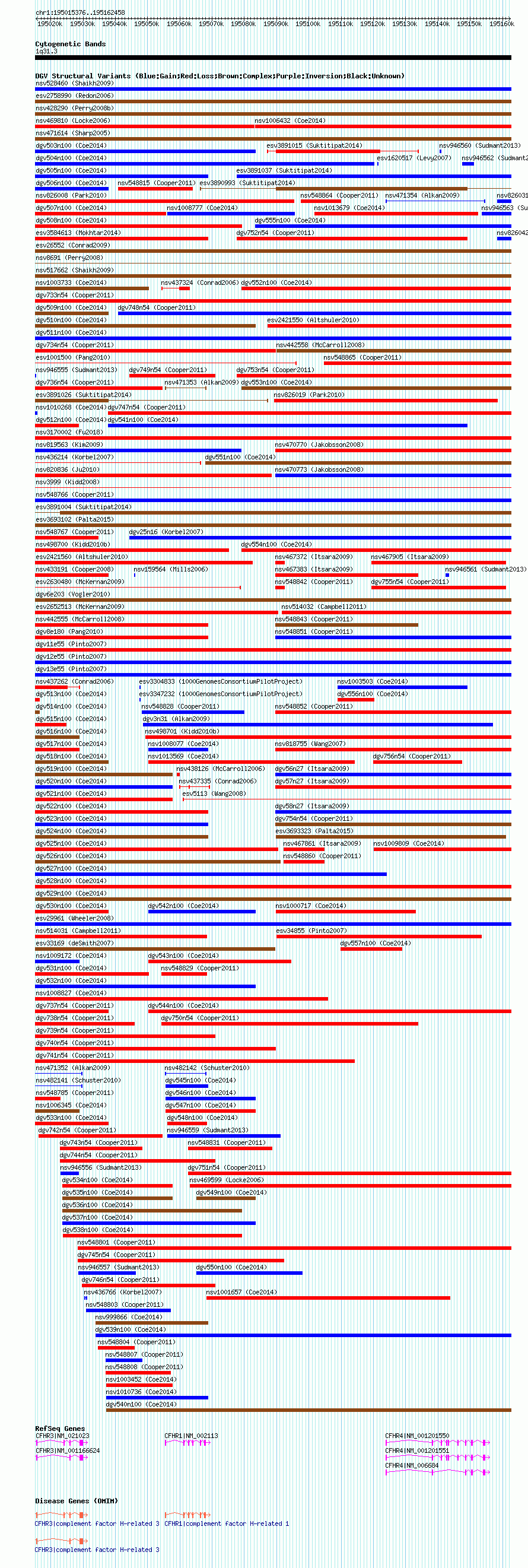 | | Variant Type | CNV loss | | Copy Number | | | Allele State | | | Allele Origin | | | Probe Count | | | Validation Flag | | | Merged Status | M | | Merged Variants | dgv528n100 | | Supporting Variants | nssv3488923, nssv3494723 | | Samples | | | Known Genes | CFHR1, CFHR3, CFHR4 | | Method | SNP array | | Analysis | Affymetrix SNP array copy number analysis | | Platform | Affymetrix SNP Array 6.0 | | Comments | | | Reference | Coe_et_al_2014 | | Pubmed ID | 25217958 | | Accession Number(s) | nsv1007967