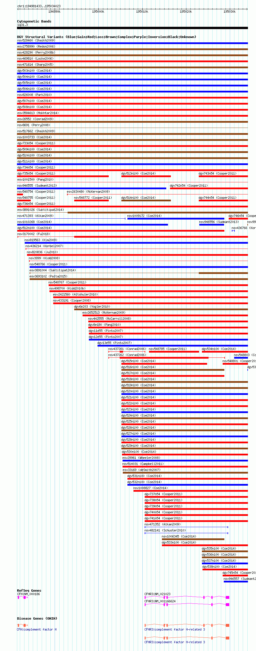 | | Variant Type | CNV gain | | Copy Number | | | Allele State | | | Allele Origin | | | Probe Count | | | Validation Flag | | | Merged Status | M | | Merged Variants | dgv506n100 | | Supporting Variants | nssv3494778 | | Samples | | | Known Genes | CFH, CFHR3 | | Method | SNP array | | Analysis | Affymetrix SNP array copy number analysis | | Platform | Affymetrix SNP Array 6.0 | | Comments | | | Reference | Coe_et_al_2014 | | Pubmed ID | 25217958 | | Accession Number(s) | nsv1008005