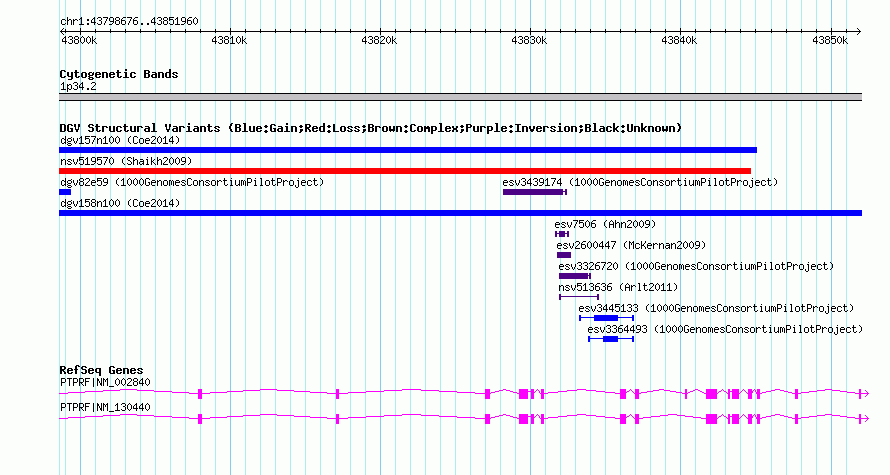 Variant DetailsVariant: nsv1008051| Internal ID | 19097270 | | Landmark | | | Location Information | | | Cytoband | 1p34.2 | | Allele length | | Assembly | Allele length | | hg38 | 53285 | | hg19 | 53285 | | hg18 | 53285 |