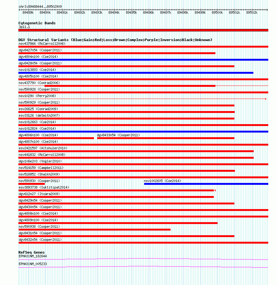 | | Variant Type | CNV loss | | Copy Number | | | Allele State | | | Allele Origin | | | Probe Count | | | Validation Flag | | | Merged Status | M | | Merged Variants | dgv4808n100 | | Supporting Variants | nssv3735163, nssv3735162 | | Samples | | | Known Genes | EPHA3 | | Method | SNP array | | Analysis | Affymetrix SNP array copy number analysis | | Platform | Affymetrix SNP Array 6.0 | | Comments | | | Reference | Coe_et_al_2014 | | Pubmed ID | 25217958 | | Accession Number(s) | nsv1008556