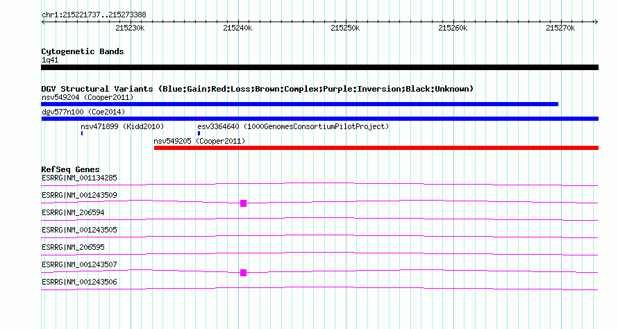 | | Variant Type | CNV gain | | Copy Number | | | Allele State | | | Allele Origin | | | Probe Count | | | Validation Flag | | | Merged Status | M | | Merged Variants | dgv577n100 | | Supporting Variants | nssv3705512, nssv3493724 | | Samples | | | Known Genes | ESRRG | | Method | SNP array | | Analysis | Affymetrix SNP array copy number analysis | | Platform | Affymetrix SNP Array 6.0 | | Comments | | | Reference | Coe_et_al_2014 | | Pubmed ID | 25217958 | | Accession Number(s) | nsv1008670