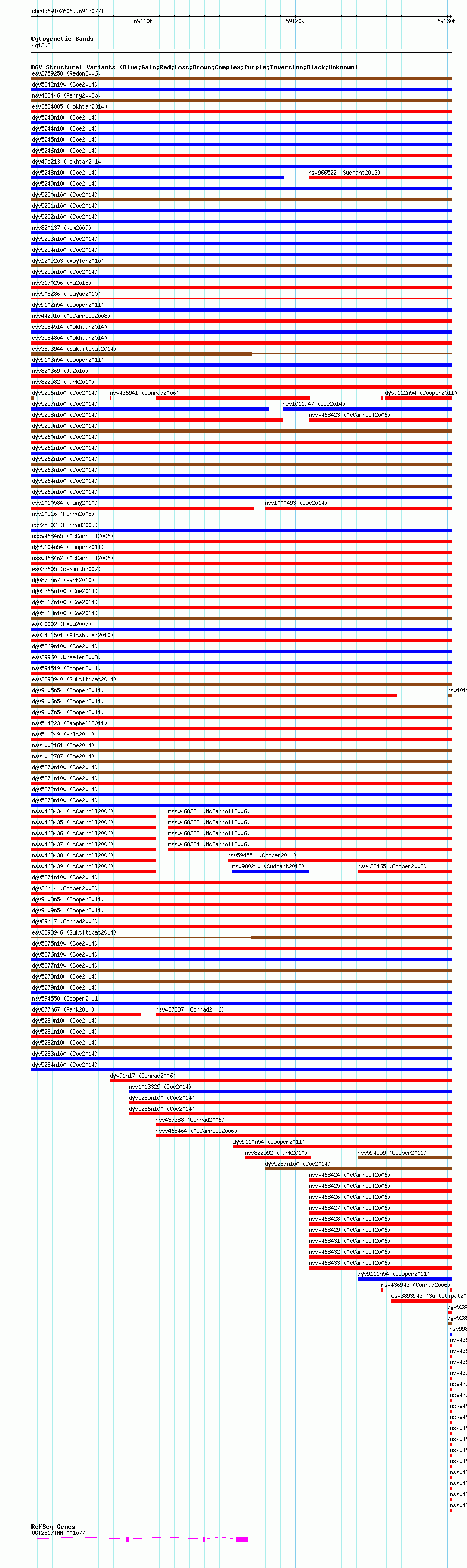 Variant DetailsVariant: nsv1008681| Internal ID | 19097898 | | Landmark | | | Location Information | | | Cytoband | 4q13.2 | | Allele length | | Assembly | Allele length | | hg38 | 27666 | | hg19 | 27666 | | hg18 | 27666 |