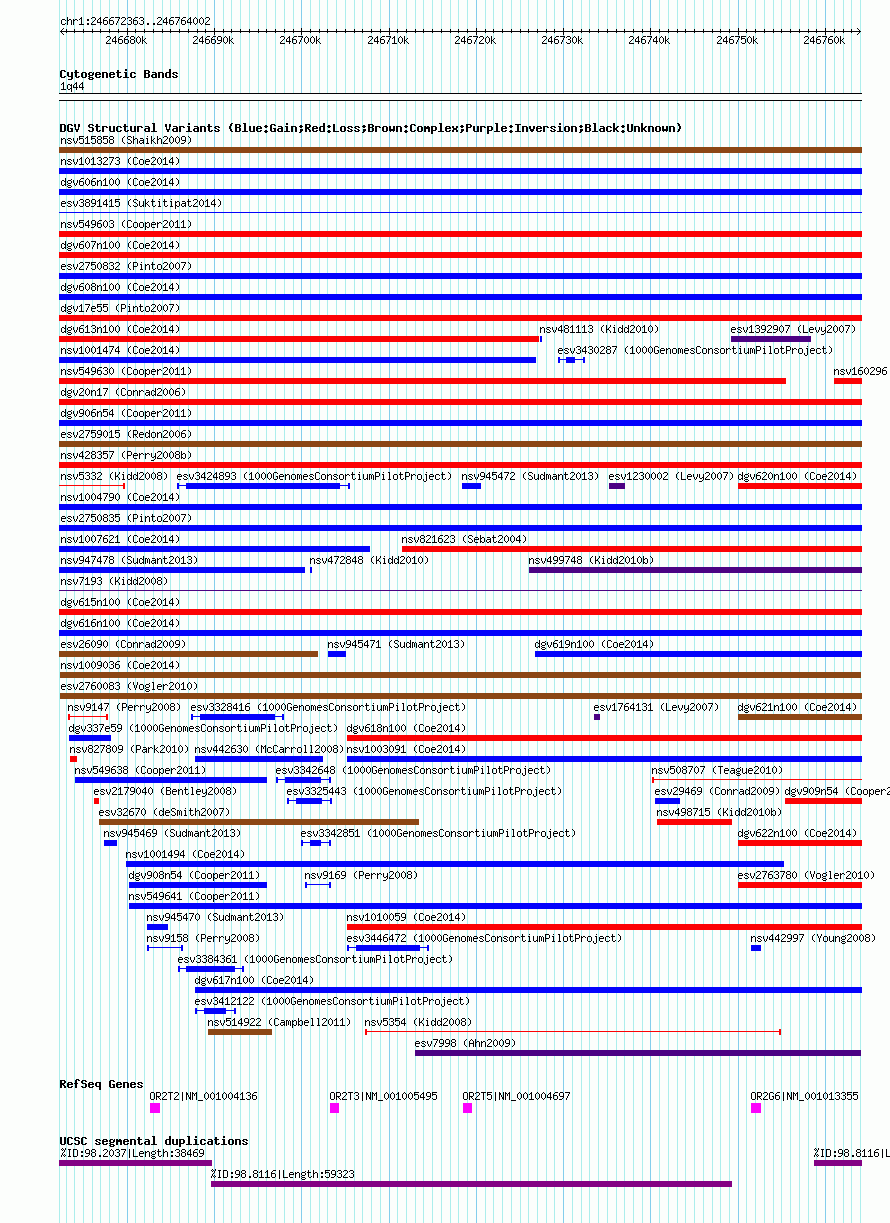 | | Variant Type | CNV gain+loss | | Copy Number | | | Allele State | | | Allele Origin | | | Probe Count | | | Validation Flag | | | Merged Status | M | | Merged Variants | | | Supporting Variants | nssv3486872, nssv3495101 | | Samples | | | Known Genes | OR2G6, OR2T2, OR2T3, OR2T5 | | Method | SNP array | | Analysis | Affymetrix SNP array copy number analysis | | Platform | Affymetrix SNP Array 6.0 | | Comments | | | Reference | Coe_et_al_2014 | | Pubmed ID | 25217958 | | Accession Number(s) | nsv1009036
