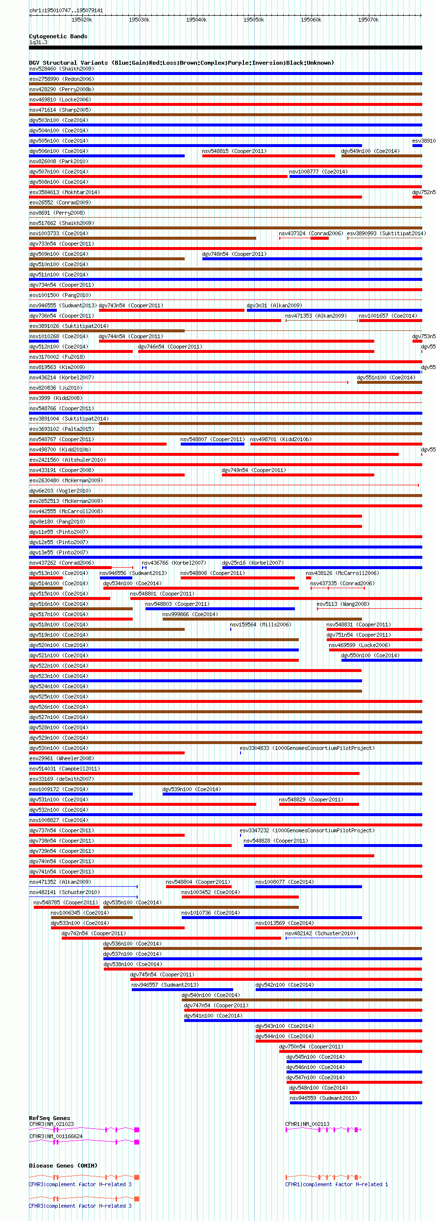 Variant DetailsVariant: nsv1009352| Internal ID | 19098570 | | Landmark | | | Location Information | | | Cytoband | 1q31.3 | | Allele length | | Assembly | Allele length | | hg38 | 68395 | | hg19 | 68395 | | hg18 | 68395 |