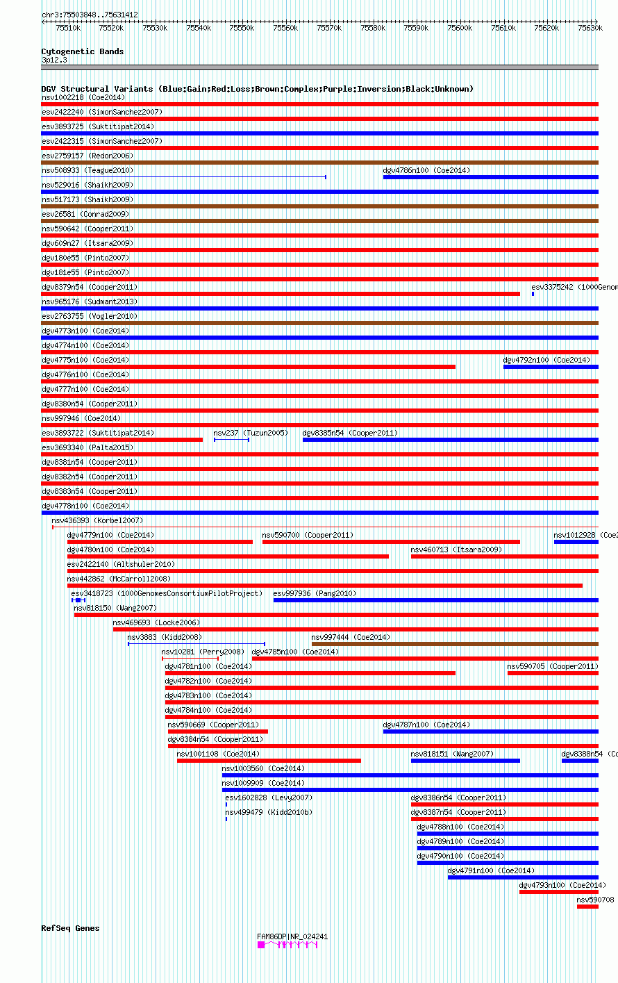 Variant DetailsVariant: nsv1009357| Internal ID | 19098575 | | Landmark | | | Location Information | | | Cytoband | 3p12.3 | | Allele length | | Assembly | Allele length | | hg38 | 127565 | | hg19 | 127565 | | hg18 | 127565 |