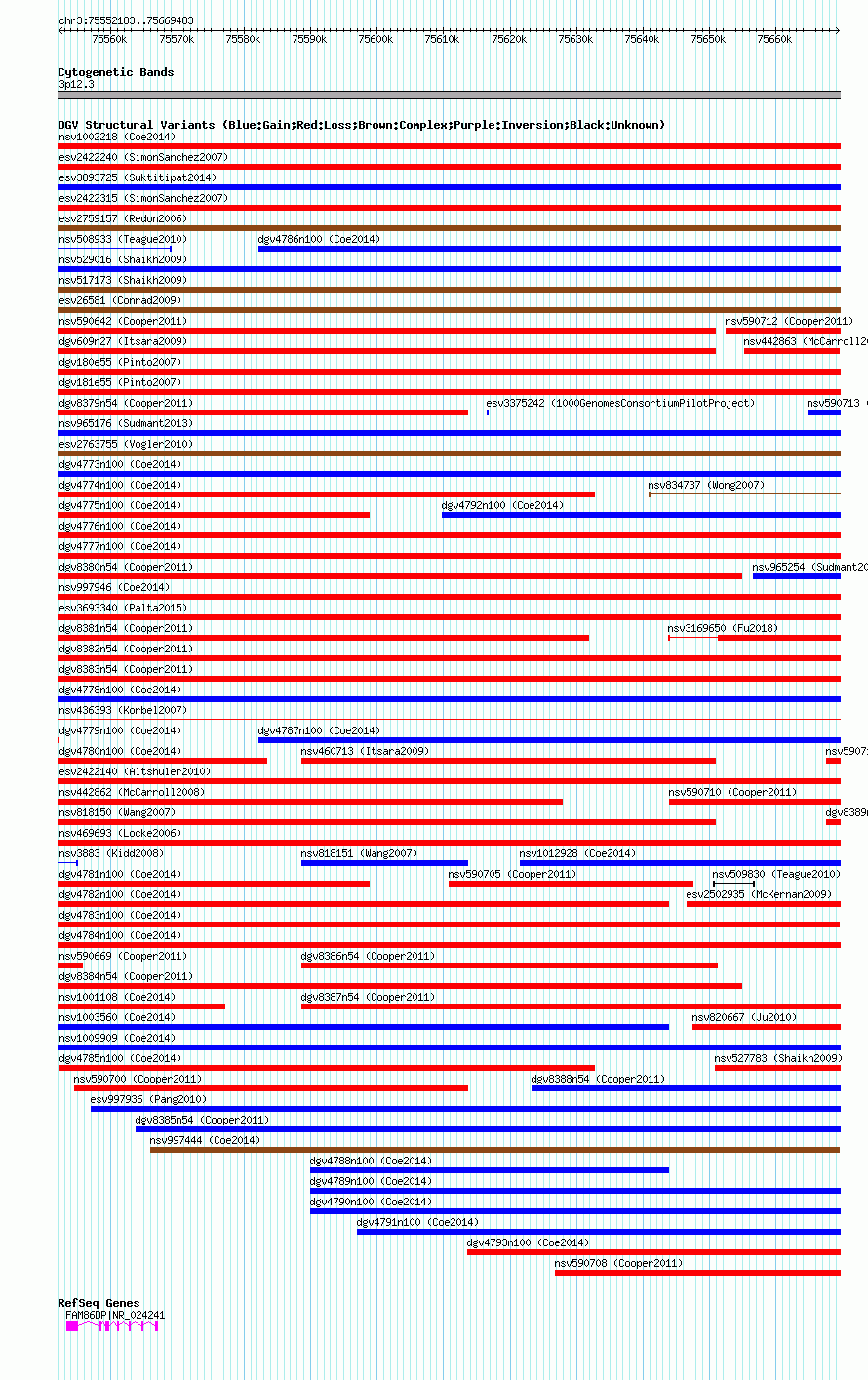 Variant DetailsVariant: nsv1009495| Internal ID | 19098713 | | Landmark | | | Location Information | | | Cytoband | 3p12.3 | | Allele length | | Assembly | Allele length | | hg38 | 117301 | | hg19 | 117301 | | hg18 | 117301 |