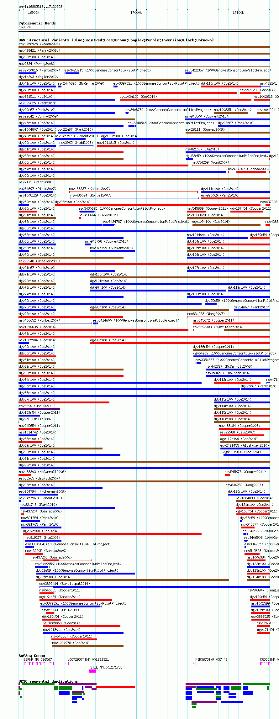 Variant DetailsVariant: nsv1009507| Internal ID | 18752038 | | Landmark | | | Location Information | | | Cytoband | 1p36.13 | | Allele length | | Assembly | Allele length | | hg38 | 244943 | | hg19 | 244943 | | hg18 | 244943 |
