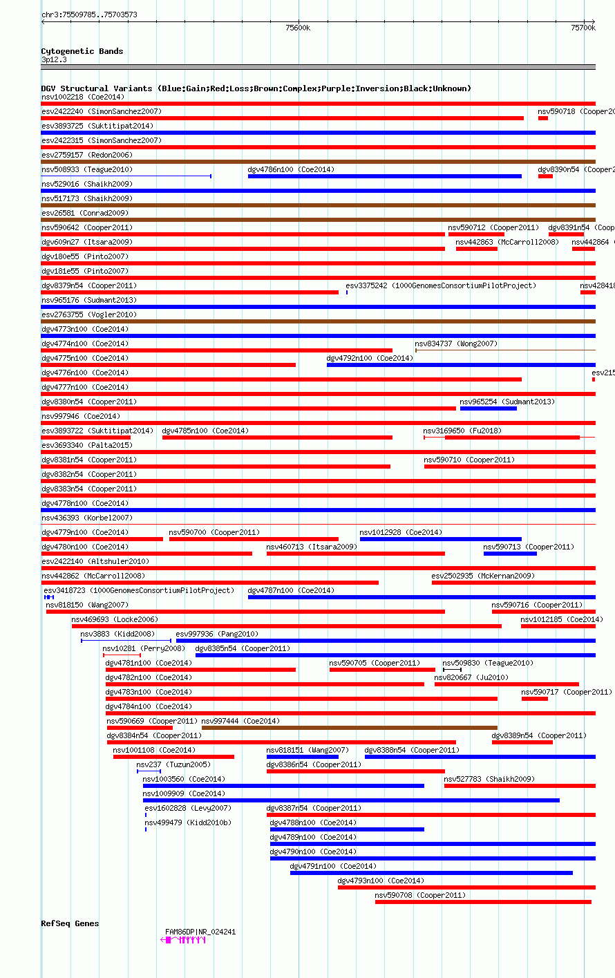 Variant DetailsVariant: nsv1009577| Internal ID | 19098795 | | Landmark | | | Location Information | | | Cytoband | 3p12.3 | | Allele length | | Assembly | Allele length | | hg38 | 193789 | | hg19 | 193789 | | hg18 | 193789 |