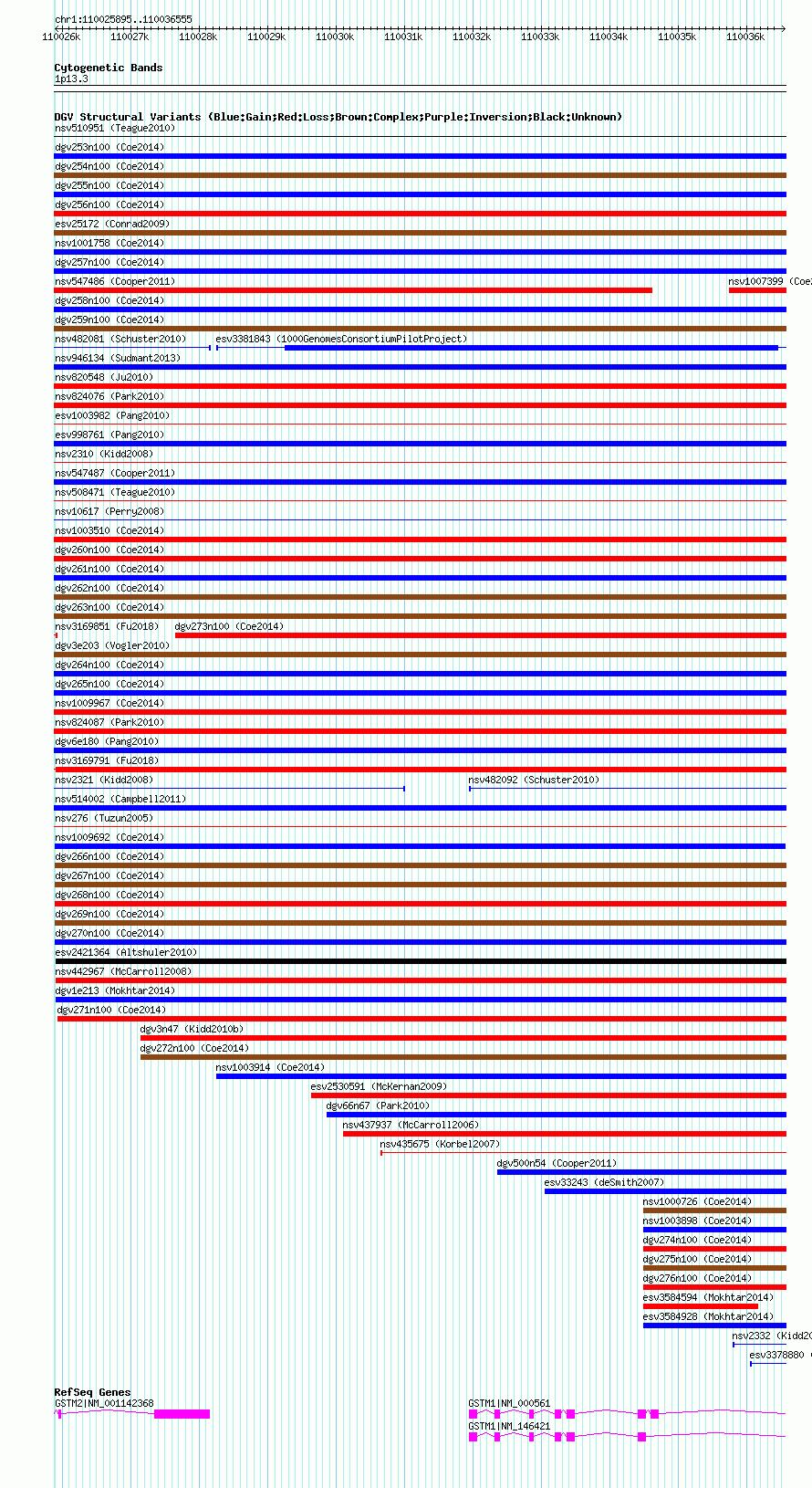 | | Variant Type | CNV gain | | Copy Number | | | Allele State | | | Allele Origin | | | Probe Count | | | Validation Flag | | | Merged Status | M | | Merged Variants | | | Supporting Variants | nssv3487494 | | Samples | | | Known Genes | GSTM1, GSTM2 | | Method | SNP array | | Analysis | Affymetrix SNP array copy number analysis | | Platform | Affymetrix SNP Array 6.0 | | Comments | | | Reference | Coe_et_al_2014 | | Pubmed ID | 25217958 | | Accession Number(s) | nsv1009692