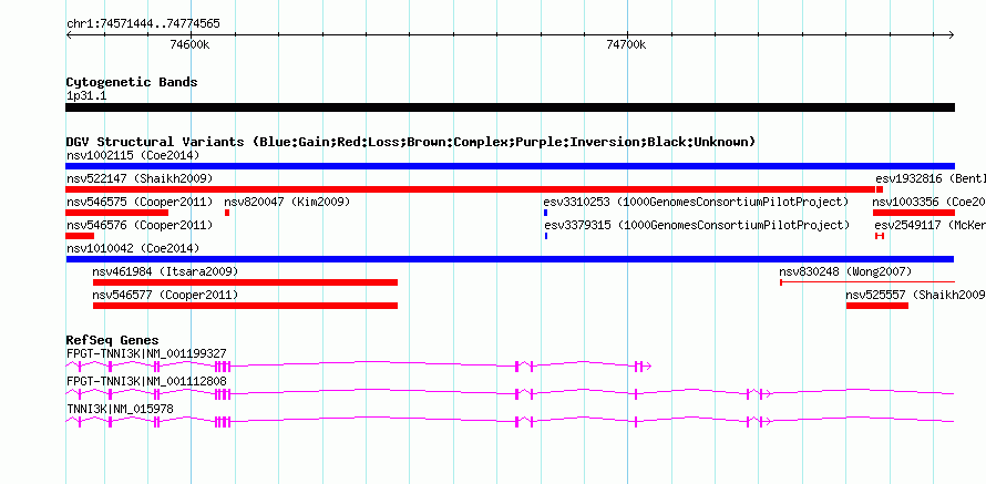 Variant DetailsVariant: nsv1010042| Internal ID | 19099261 | | Landmark | | | Location Information | | | Cytoband | 1p31.1 | | Allele length | | Assembly | Allele length | | hg38 | 203122 | | hg19 | 203122 | | hg18 | 203122 |