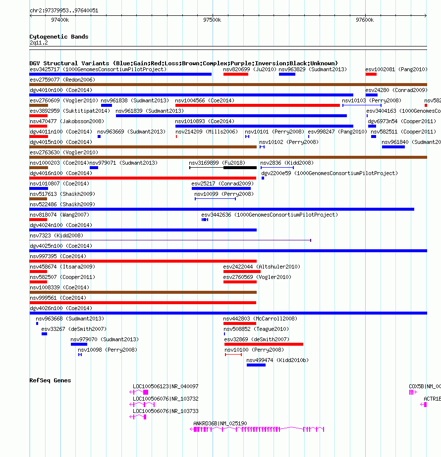 Variant DetailsVariant: nsv1010167| Internal ID | 19099386 | | Landmark | | | Location Information | | | Cytoband | 2q11.2 | | Allele length | | Assembly | Allele length | | hg38 | 296669 | | hg19 | 259806 | | hg18 | 260099 |