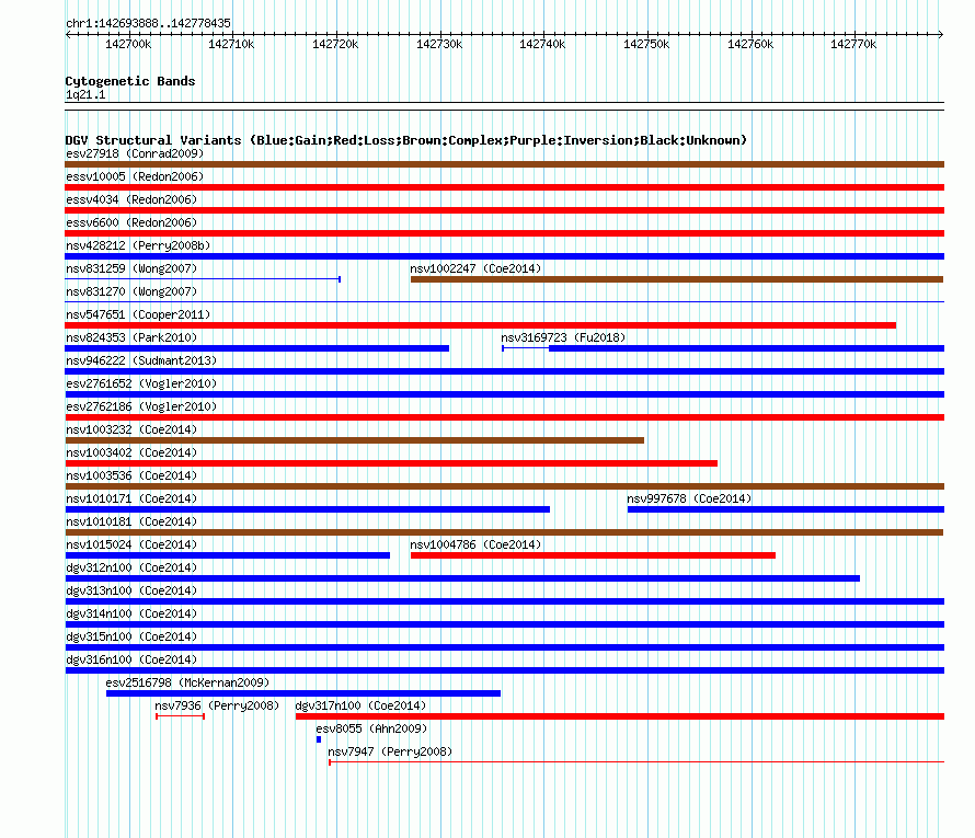 Variant DetailsVariant: nsv1010181| Internal ID | 19099399 | | Landmark | | | Location Information | | | Cytoband | 1q21.1 | | Allele length | | Assembly | Allele length | | hg38 | 81111 | | hg19 | 84549 | | hg18 | 84548 |