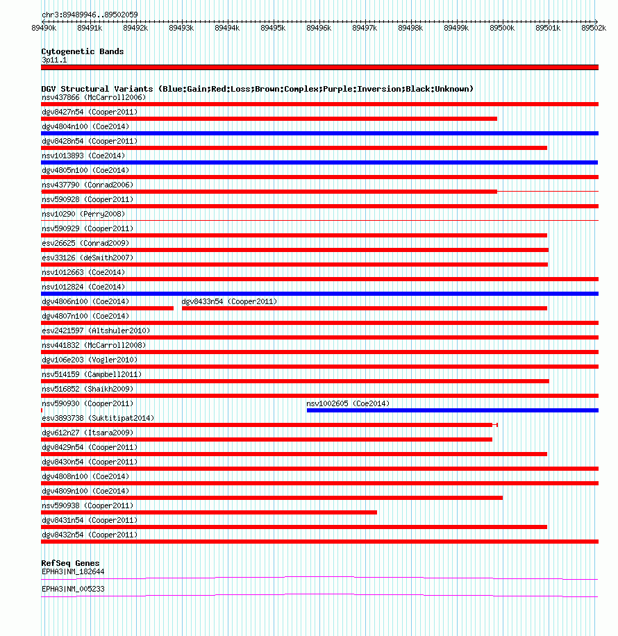 | | Variant Type | CNV loss | | Copy Number | | | Allele State | | | Allele Origin | | | Probe Count | | | Validation Flag | | | Merged Status | M | | Merged Variants | dgv4808n100 | | Supporting Variants | nssv3603260, nssv3603256, nssv3603255, nssv3603257, nssv3735175, nssv3603254, nssv3603259, nssv3603258 | | Samples | | | Known Genes | EPHA3 | | Method | SNP array | | Analysis | Affymetrix SNP array copy number analysis | | Platform | Affymetrix SNP Array 6.0 | | Comments | | | Reference | Coe_et_al_2014 | | Pubmed ID | 25217958 | | Accession Number(s) | nsv1010377