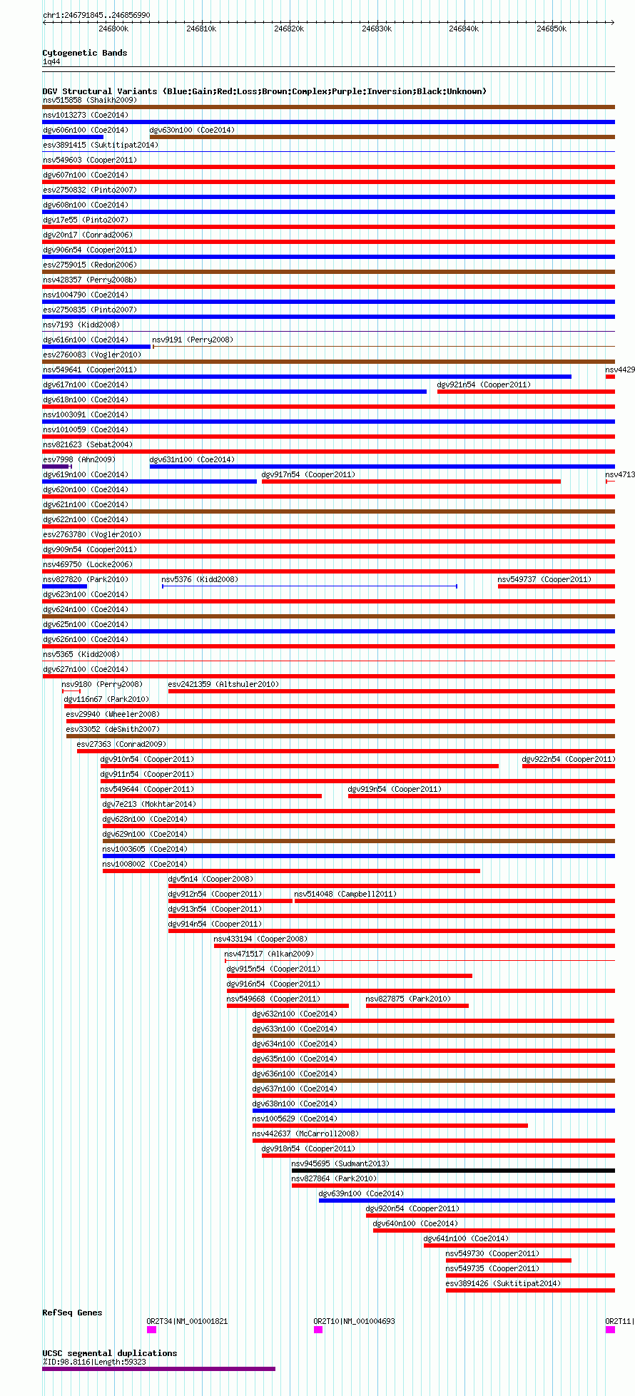Variant DetailsVariant: nsv1010502| Internal ID | 18753033 | | Landmark | | | Location Information | | | Cytoband | 1q44 | | Allele length | | Assembly | Allele length | | hg38 | 65146 | | hg19 | 65146 | | hg18 | 65146 |