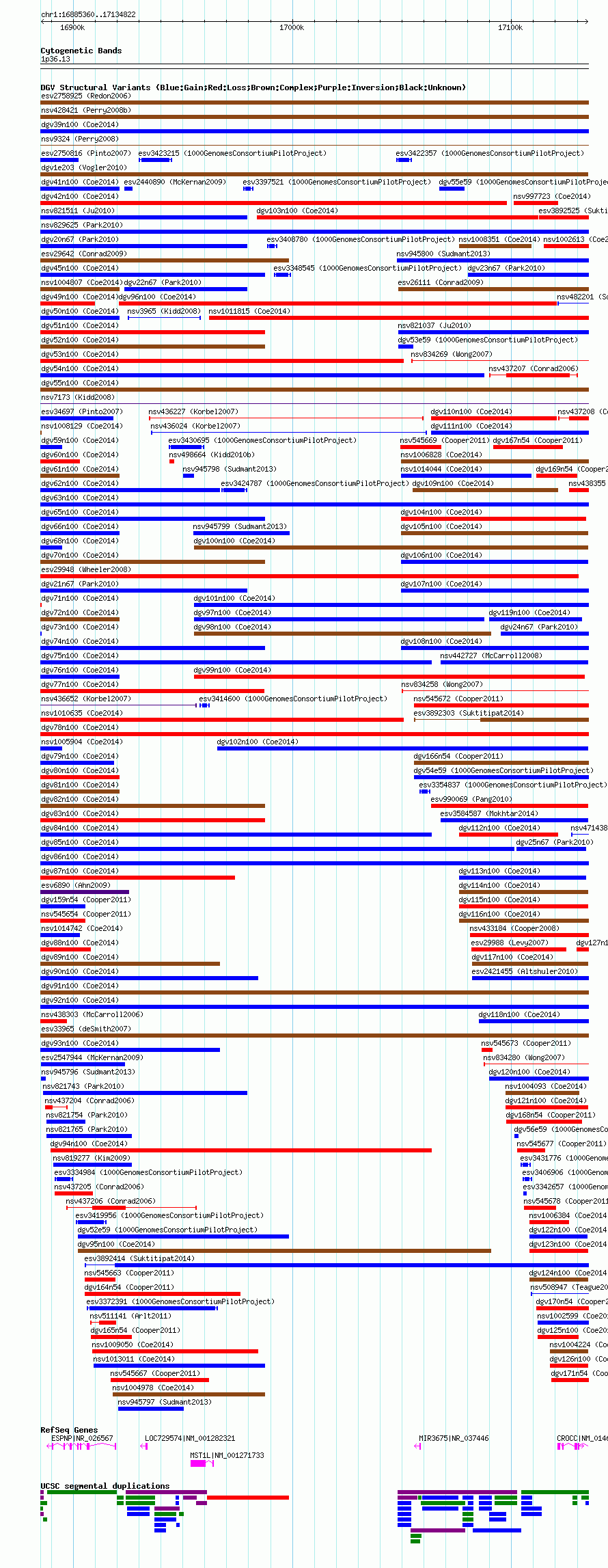 Variant DetailsVariant: nsv1010964| Internal ID | 18753497 | | Landmark | | | Location Information | | | Cytoband | 1p36.13 | | Allele length | | Assembly | Allele length | | hg38 | 249463 | | hg19 | 249463 | | hg18 | 249463 |