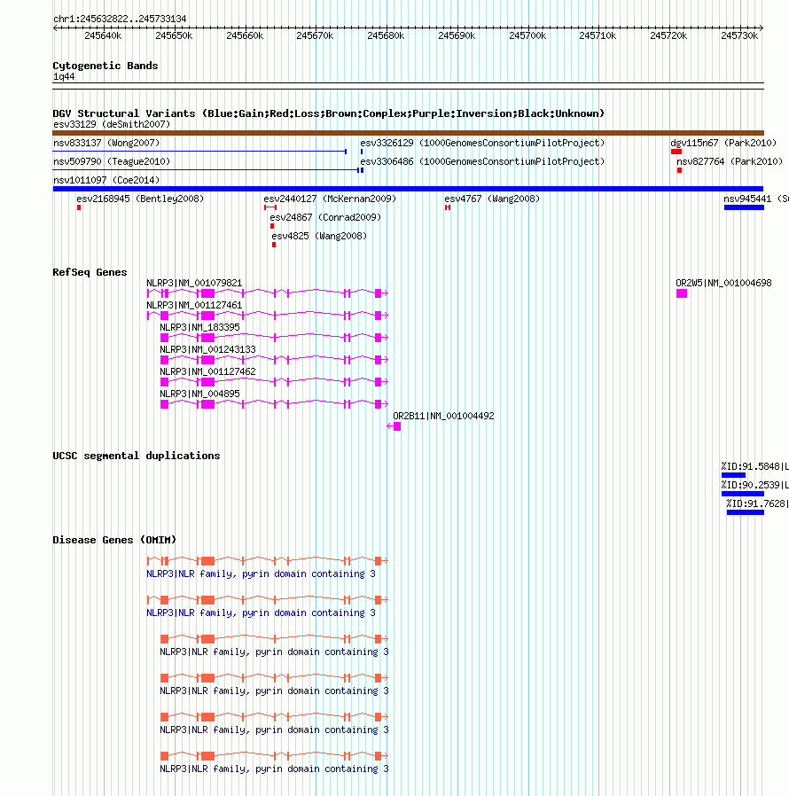 | Variant Type | CNV gain | Copy Number | | Allele State | | Allele Origin | | Probe Count | | Validation Flag | | Merged Status | M | Merged Variants | | Supporting Variants | nssv3705574 | Samples | | Known Genes | NLRP3, OR2B11, OR2W5 | Method | SNP array | Analysis | Affymetrix SNP array copy number analysis | Platform | Affymetrix SNP Array 6.0 | Comments | | Reference | Coe_et_al_2014 | Pubmed ID | 25217958 | Accession Number(s) | nsv1011097