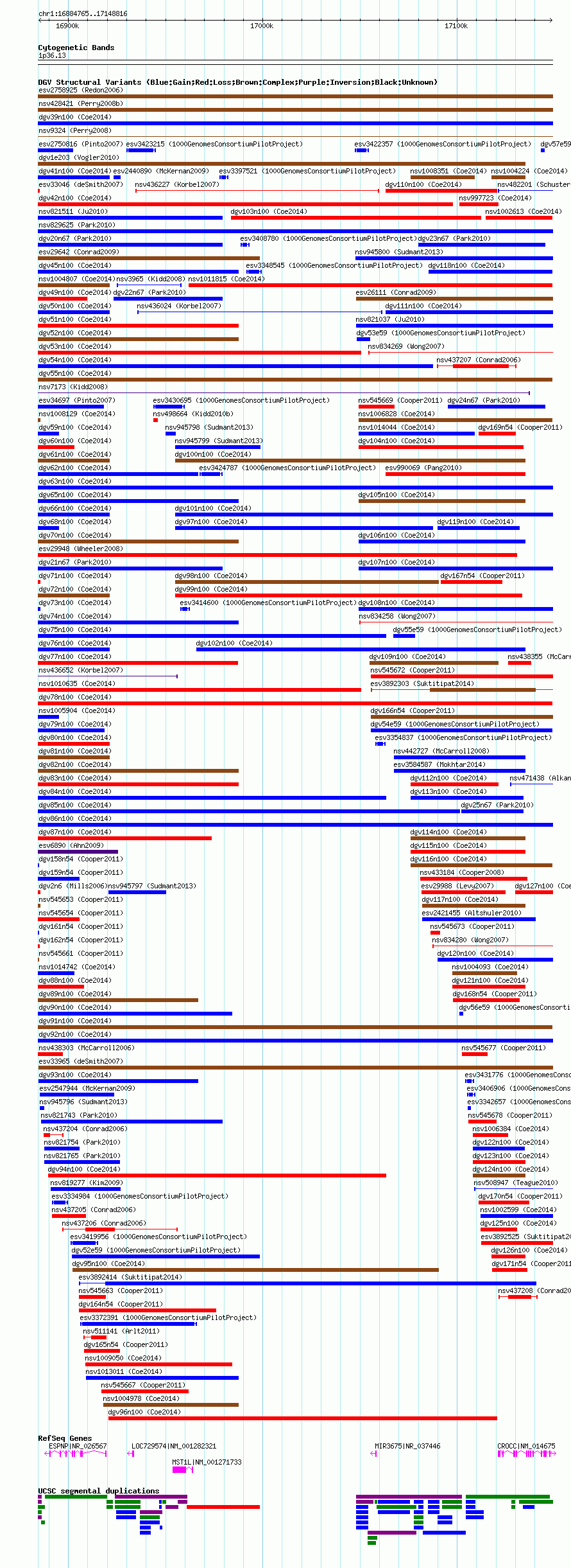 Variant DetailsVariant: nsv1011194| Internal ID | 18753728 | | Landmark | | | Location Information | | | Cytoband | 1p36.13 | | Allele length | | Assembly | Allele length | | hg38 | 264052 | | hg19 | 264052 | | hg18 | 264052 |