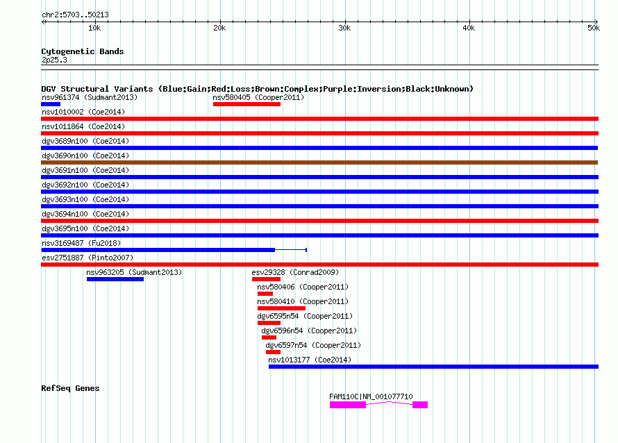 Variant DetailsVariant: nsv1011448| Internal ID | 19100665 | | Landmark | | | Location Information | | | Cytoband | 2p25.3 | | Allele length | | Assembly | Allele length | | hg38 | 44511 | | hg19 | 44511 | | hg18 | 44511 |