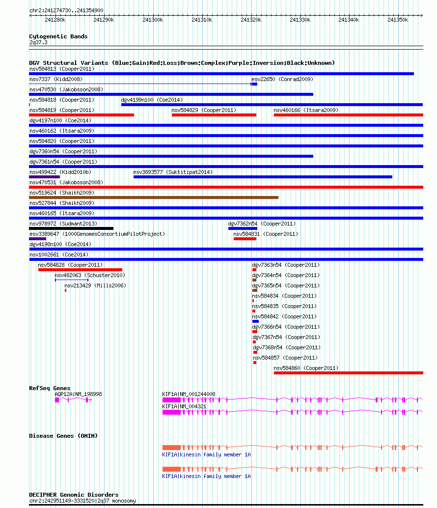 | | Variant Type | CNV gain | | Copy Number | | | Allele State | | | Allele Origin | | | Probe Count | | | Validation Flag | | | Merged Status | M | | Merged Variants | dgv4198n100 | | Supporting Variants | nssv3586992, nssv3729387, nssv3586986, nssv3586985, nssv3586991, nssv3586988, nssv3730126, nssv3586984, nssv3586989, nssv3586987, nssv3586990, nssv3586994, nssv3586993 | | Samples | | | Known Genes | AQP12A, KIF1A | | Method | SNP array | | Analysis | Affymetrix SNP array copy number analysis | | Platform | Affymetrix SNP Array 6.0 | | Comments | | | Reference | Coe_et_al_2014 | | Pubmed ID | 25217958 | | Accession Number(s) | nsv1011471