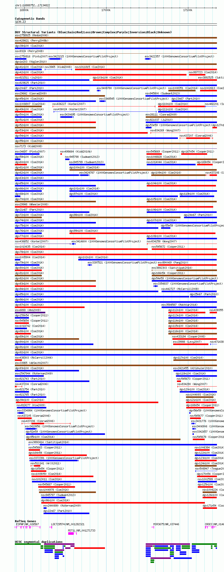 Variant DetailsVariant: nsv1011507| Internal ID | 18754041 | | Landmark | | | Location Information | | | Cytoband | 1p36.13 | | Allele length | | Assembly | Allele length | | hg38 | 246071 | | hg19 | 246071 | | hg18 | 246071 |