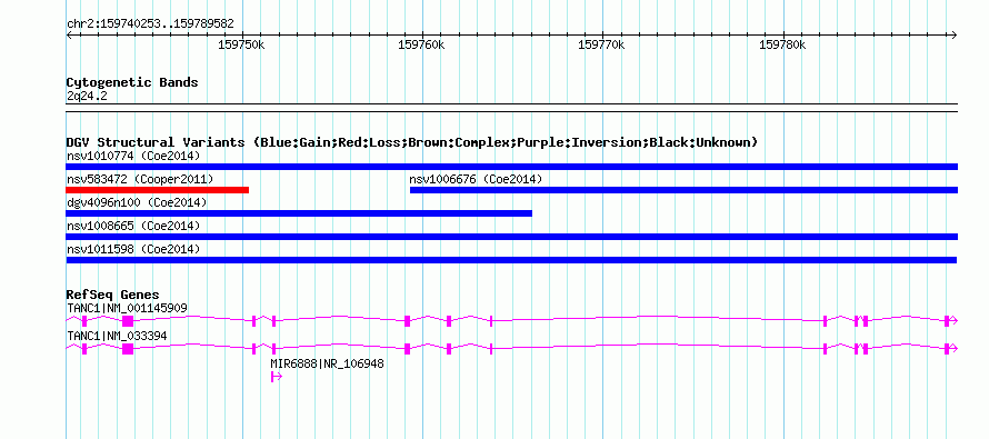 | | Variant Type | CNV gain | | Copy Number | | | Allele State | | | Allele Origin | | | Probe Count | | | Validation Flag | | | Merged Status | M | | Merged Variants | | | Supporting Variants | nssv3582986 | | Samples | | | Known Genes | MIR6888, TANC1 | | Method | SNP array | | Analysis | Affymetrix SNP array copy number analysis | | Platform | Affymetrix SNP Array 6.0 | | Comments | | | Reference | Coe_et_al_2014 | | Pubmed ID | 25217958 | | Accession Number(s) | nsv1011598